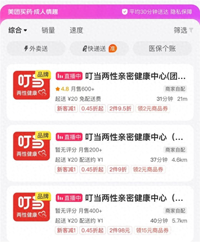据了解,叮当快药与美团买药此前在进博会期间官宣合作。双方聚焦在两性健康品类开设专业店型,并联动杰士邦等上游工业品牌,丰富高品质两性健康产品供给。美团买药搜索显示,叮当快药在北京、上海两地试水该模式,增设数百家线上门店,覆盖了两性健康药品、成人情趣用品、成人医疗器械等多个品类。